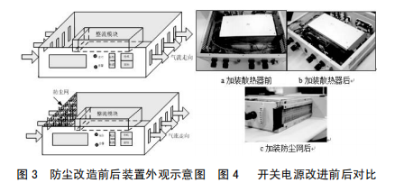 3.2在裝置本體進風(fēng)孔加防塵網(wǎng),防止灰塵進入裝置內(nèi)部,設(shè)備維護人員定期對濾網(wǎng)進行清掃,從而減輕元器件表面覆塵,利于裝置正常散熱,如圖3所示加裝防塵網(wǎng)后開關(guān)電源示意圖。對裝置實施上述改進后,其改進前后對比如圖4所示。
