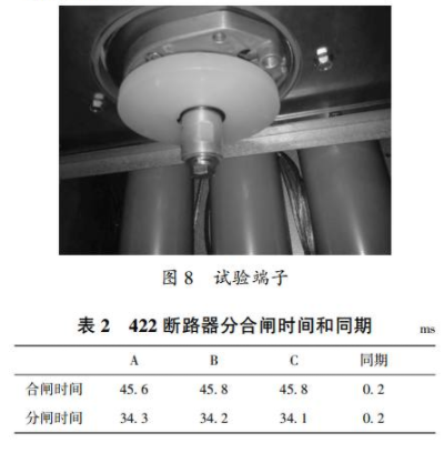 本次試驗(yàn)選取422斷路器進(jìn)行機(jī)械特性測(cè)試,按圖6進(jìn)行試驗(yàn)接線。將4221隔離開關(guān)置于接地位置,將試驗(yàn)端子接到柜內(nèi)電纜接口,然后將試驗(yàn)線接到試驗(yàn)端子下端進(jìn)行試驗(yàn)。試驗(yàn)端子如圖8所示。422斷路器分合閘時(shí)間和同期見表2。