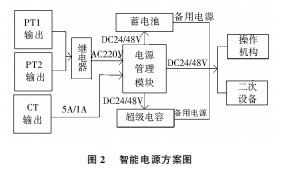 組織、操控器、通訊終端等二次設備都需求完成不間斷供電。為了進步供電的牢靠性,要求在供電電源失電時,二次回路仍然會有電源,可以持續(xù)牢靠的動作,環(huán)網(wǎng)柜中有必要具有備用電源。為了進步供電電源的牢靠性本電源的規(guī)劃首要選用了如下方法:(1)環(huán)網(wǎng)柜一般選用雙進線,兩條進線互為備用給電源的充電模塊供電,當其中一條進線失電時,由繼電器將另一條進線的220V電源轉給充電模塊,保證整個柜子的二次回路持續(xù)供電。(2)當環(huán)網(wǎng)柜的兩條進線都失電的時分,為了使二次回路持續(xù)帶電,需求由備用電源持續(xù)供電。現(xiàn)在首要的備用電源是不間斷電源(UPS)和蓄電池,還有的選用超級電容供電。為了進步供電的牢靠性,本電源計劃選用蓄電池與超極電容相結合,兩種電源可互為備用,可以進一步進步供電的牢靠性。智能電源的計劃如圖2所示。