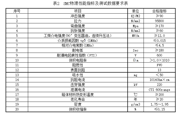 2.3.1分支箱外殼選用S304不銹鋼資料,箱體、門體資料厚度均不應(yīng)小于2毫米,或SMC復(fù)合資料箱體,SMC物理功用目標(biāo)及測(cè)試數(shù)據(jù)滿足表2的要求。