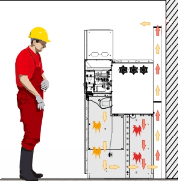 壓力通過(guò)后部通道上部開釋出來(lái),氣流出來(lái)后沿著箱頂部走,氣流已通過(guò)長(zhǎng)間隔的活動(dòng),焚燒火焰及沖擊力已明顯減小,對(duì)設(shè)備和人員的傷害較小,避免開釋到電纜溝對(duì)電纜的損壞,或氣箱電弧壓力直接從頂部開釋到開關(guān)室頂部反彈,直接損害柜前人員,或反彈進(jìn)一步燒損其它設(shè)備。
