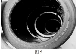 事端分支箱電纜終端所運(yùn)用的硅脂密封功用不良,故障發(fā)生后,當(dāng)拆撥其它兩相電纜頭時(shí),由于硅脂出現(xiàn)干枯粘結(jié)(如圖5),需求多人合力才調(diào)撥出,可見硅脂已不能起到潤滑防潮與絕緣的效果,不能與電纜頭同“呼吸”,彈性功用大為下降。