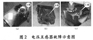 2012年3月26日,檢修人員連夜對35kV垣潔線56號線路電壓互感器進行拆除檢查,發(fā)現(xiàn)電壓互感器A、B、C相損壞,A、B相有炸裂現(xiàn)象;B相PT損害嚴峻,側(cè)壁脫離本體,插頭掉落,繞組徹底毀損;A相PT插頭掉落,表面漆層及噴鋁層受損;C相表面漆層及噴鋁層受損,其它部位正常,如圖2所示。