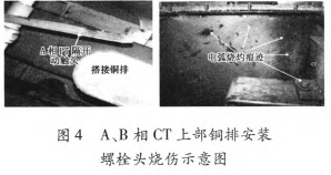 斷路器氣室內(nèi)部PT阻隔開關(guān)A相動觸頭變形,未搭在觸摸銅排上,端頭有明顯炙烤痕跡;B相動觸頭端頭有燒傷痕跡;A相CT旁氣室壁有明顯燒傷痕跡;A相和B相CT上部銅排設(shè)備螺栓頭燒傷,斷路器室頂部方位有電弧燒傷痕跡,如圖4所示。