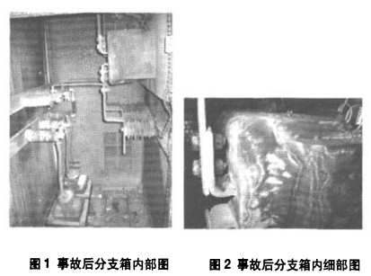 2007年7月18日某地輸配電線路發(fā)生跳閘,在巡線至石板坡電纜分支箱時(shí),發(fā)現(xiàn)電纜分支箱兩端的開關(guān)柜俑壁發(fā)生嚴(yán)峻變形、601進(jìn)線開關(guān)柜面板有飛弧、放電及炭黑等現(xiàn)象。外觀上,箱體內(nèi)水跡明顯。表面柜門已銹死,不得不撬開,操作安排已無法翻滾、只能將其潰散后翻開關(guān)柜門。翻開#601開關(guān)柜電纜室發(fā)現(xiàn):計(jì)量TⅣV的熔斷器及支撐絕緣子兩相悉數(shù)炸碎、另一相熔斷器發(fā)生分裂,支撐絕緣子發(fā)生破損,AT表面有爬電痕跡,柜體多處存在放電痕跡,如圖1所示。翻開相鄰距離查看,情況相同嚴(yán)峻,導(dǎo)電部分受潮嚴(yán)峻,銅排及固定鏢栓已長鹵銹,柜體表面有多處爬電痕跡,見圖2。該分支箱為某電器廠制造,2003年投運(yùn)、僅3年多。