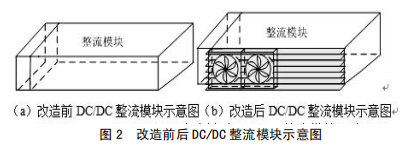 (1)在裝置功率元件一側(cè)加裝散熱片,并于散熱片上面裝設(shè)常規(guī)風(fēng)扇,從而擴大散熱面積,增強空氣流通,起到散熱降溫作用,如圖3所示改進前后示意圖。