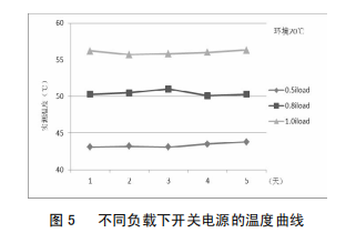 改進后,為驗證改進效果,對開關(guān)電源分別在0.5倍、0.8倍及1.0倍負(fù)載下進行了為期5天的帶負(fù)荷試驗,圖5為不同負(fù)載下開關(guān)電源的溫度曲線,由圖5可知,隨著負(fù)荷的增大,開關(guān)電源問題總體呈上升趨勢;負(fù)載不變的情況下,同一溫度曲線基本保持平滑;開關(guān)電源在額定負(fù)載下運行,最高溫度不超過57℃,未達報警值,開關(guān)電源可靠性得到顯著提高。