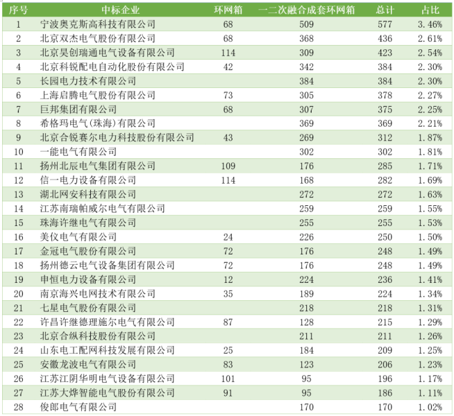 通過(guò)環(huán)網(wǎng)箱單獨(dú)招標(biāo)中標(biāo)的企業(yè)中,北京昊創(chuàng)瑞通電氣設(shè)備有限公司和信一電力設(shè)備有限公司市場(chǎng)份額占3.31%,共有6家企業(yè)市場(chǎng)份額在3%以上。
