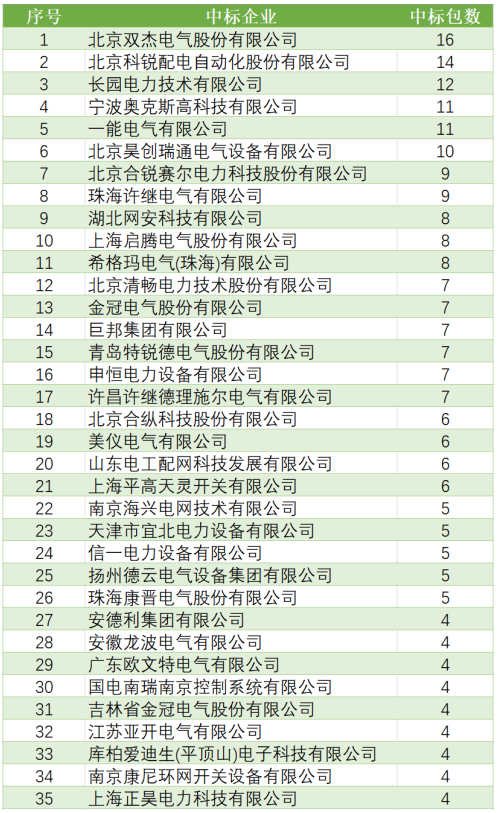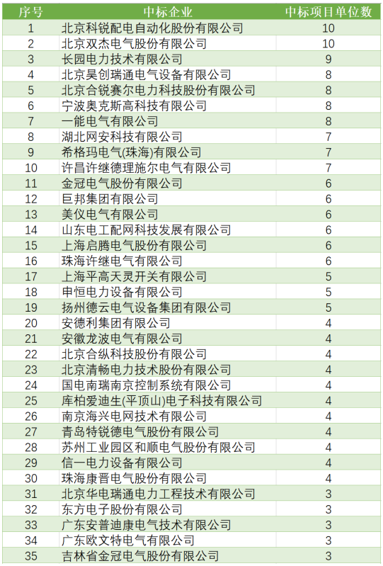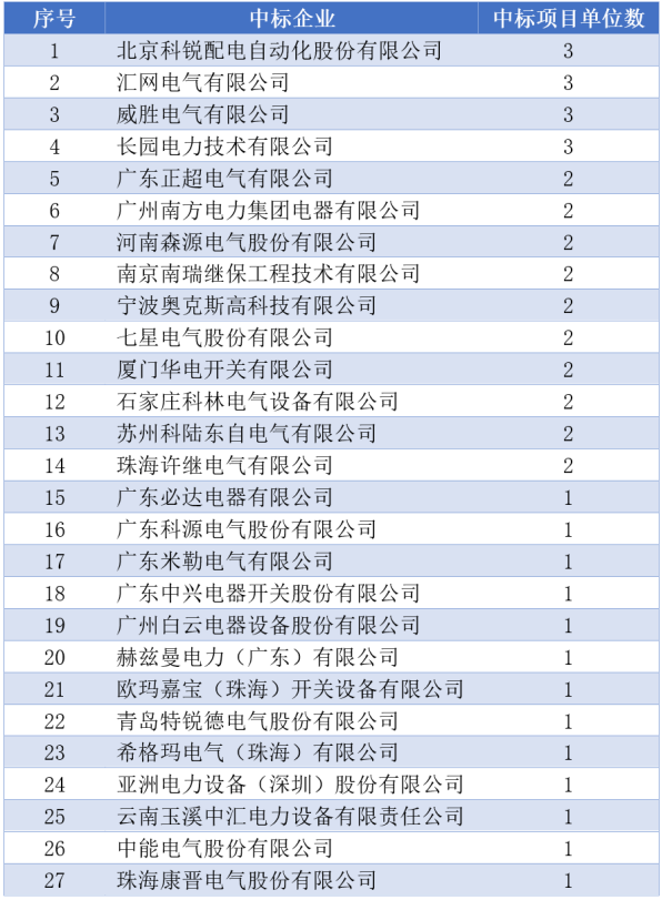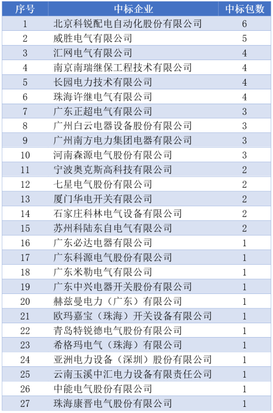 總體中標(biāo)數(shù)量方面,北京科銳配電自動(dòng)化股份有限公司中標(biāo)金額達(dá)到約2億元;另有4家企業(yè)超過(guò)約1億元。